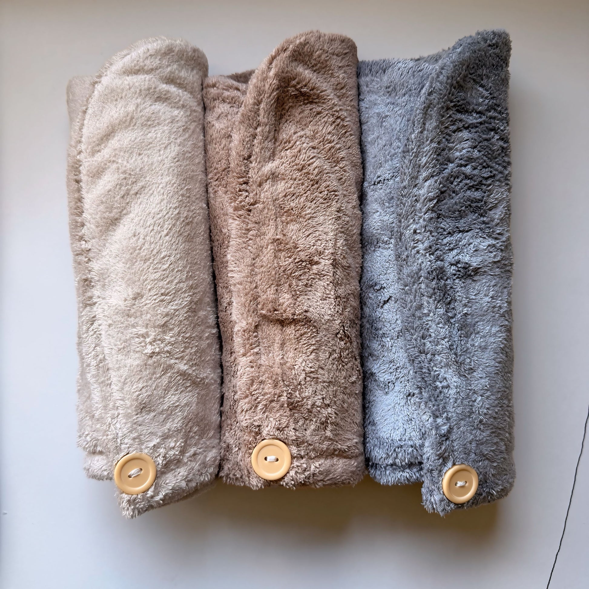 Quick-Drying Microfiber Hair Towel in our teddy bear, softest fabric yet. Great for drying hair or setting and plopping curls. Highly absorbent microfiber material is gentle on all hair types. Helps reduce heat drying time, tames frizz & reduces hair breakage with friction-free hair drying. Look chic and be comfortable during your post-shower routine!